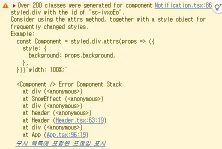 // SnowEffect.tsx const SnowEffect = () => { const snowflakes = Array.from({ length: 50 }, () => ({ $size: randomRange(8, 20), $delay: randomRange(0, -10), $duration: randomRange(5, 10), $startX: randomRange(-150, 150), })); return ( <SnowEffectContainer> {snowflakes.map((flake, index) => ( <Snow key={index} $size={flake.$size} $delay={flake.$delay} $duration={flake.$duration} $startX={flake.$startX} /> ))} </SnowEffectContainer> ); };// style.ts (일부) export const Snow = styled.div.attrs<SnowProps>( ({ $size, $delay, $duration, $startX }) => ({ style: { width: `${$size}px`, height: `${$size}px`, left: `${$startX}vw`, animationDelay: `${$delay}s`, animationDuration: `${$duration}s`, }, }), )<SnowProps>` animation: ${fallAnimation} linear infinite; `;