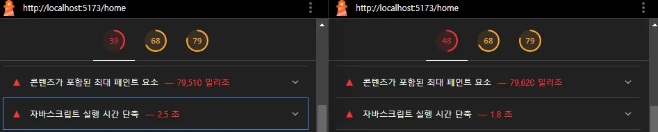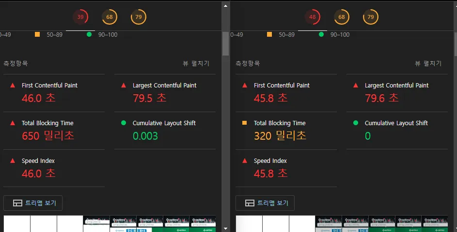 TBT도 50%로 300밀리초(0.3초)정도의 프레임이 개선되며 메인 스레드 차단 시간을 줄어들었고