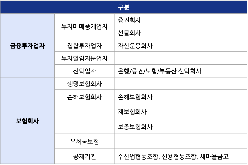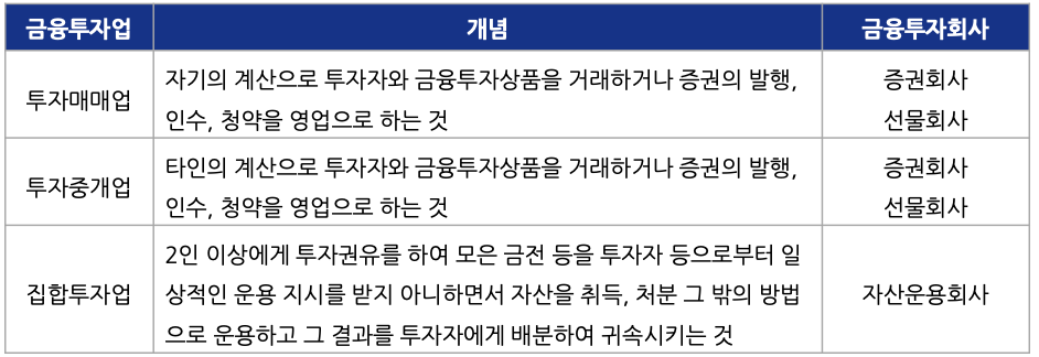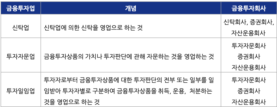 금융투자회사는 표로 분류하여 설명.