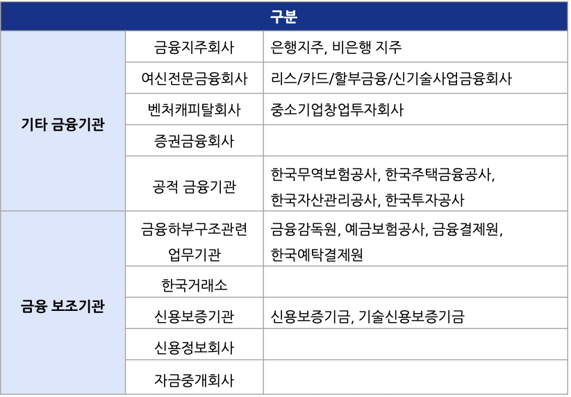 - 여신전문금융회사: 수신기능은 없이 여신업무만을 수행하는 금융회사