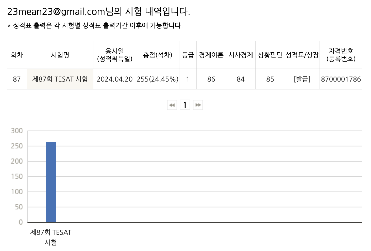 2024년 87회 정기 TESAT 시험 결과. 점수가 참 고르다. 계기